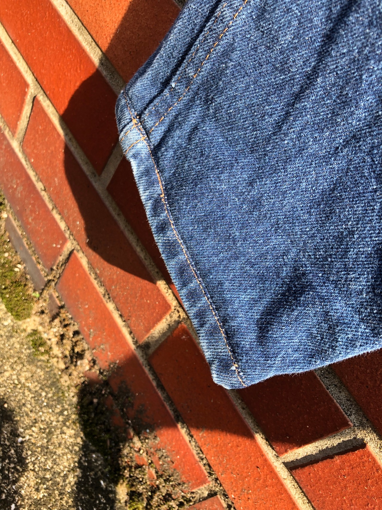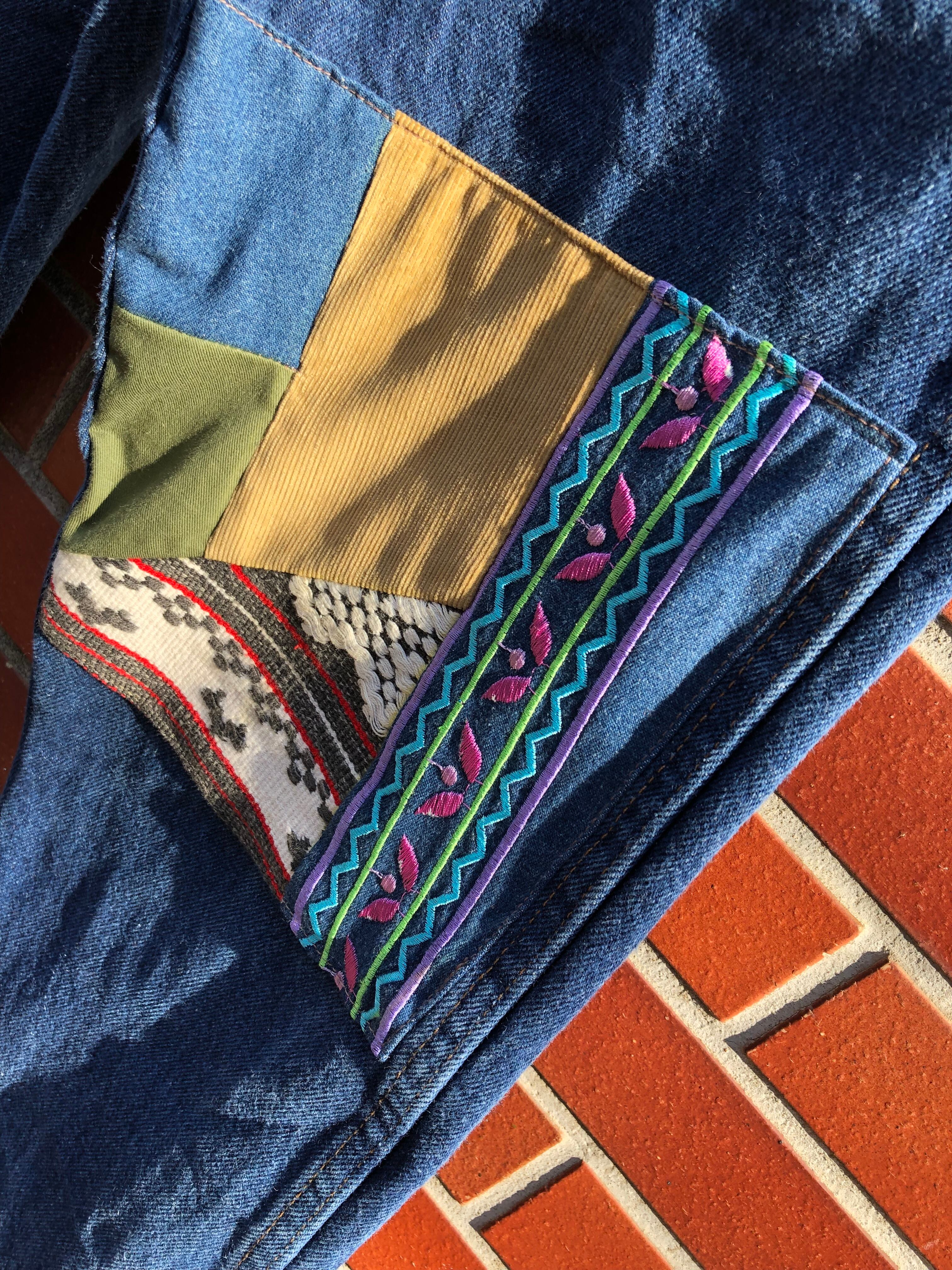 パッチワーク部分は古着の刺繍生地やラグ、ミリタリー生地、コーデュロイなどをデニムの色味に合わせて組み合わせ